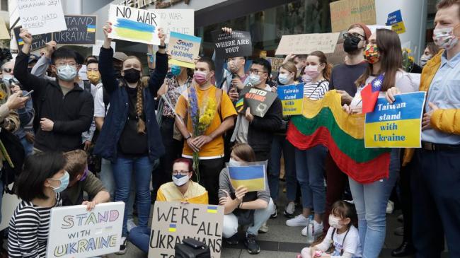 На Тайвані десятки членів слов'янської громади зібралися в п'ятницю на розі вулиць міста Тайбей, щоб показати солідарність з Україною.
